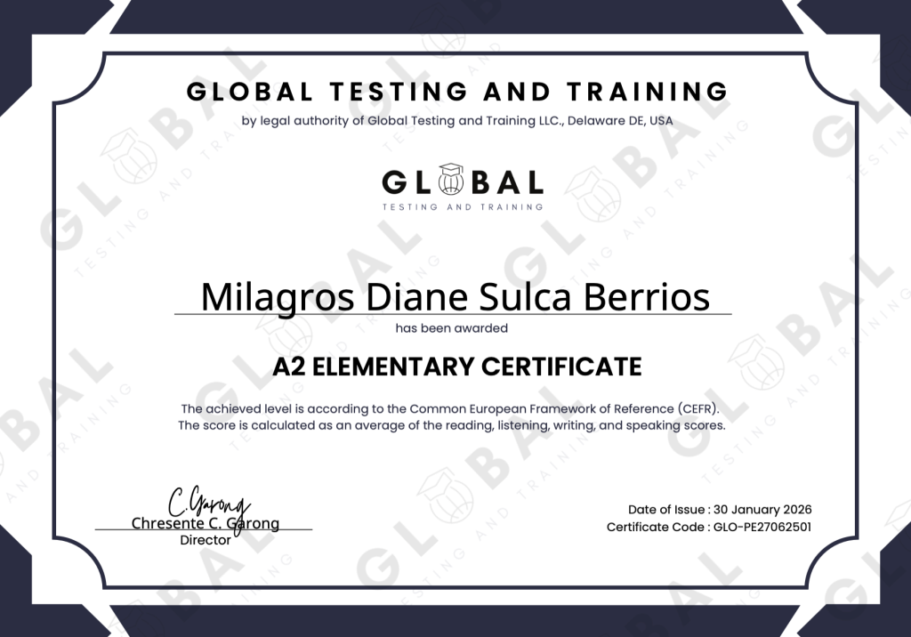 We hereby confirm that the certificate reflected below has been verified as authentic and was duly issued by Global Testing and Training.